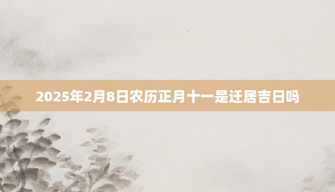 2025年2月8日农历正月十一是迁居吉日吗当日不适合迁居根据该日的黄历信息分析可得,2025年2月8日为黑道日,就民间说法来看,黑道日不利行事,若这一日迁居,可能会有不好的影响,但黑道日并不是完全忌讳迁...2024-12-22