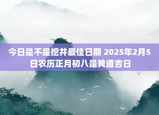 今日是不是挖井最佳日期 2025年2月5日农历正月初八是黄道吉日当日适合挖井根据该日的黄历信息分析可得,2025年2月5日为黄道日,黄道日即是民间的黄道吉日,吉日办事可一顺百顺,对事情有着正向积极的促进作用,因此2025年2...2024-12-08
