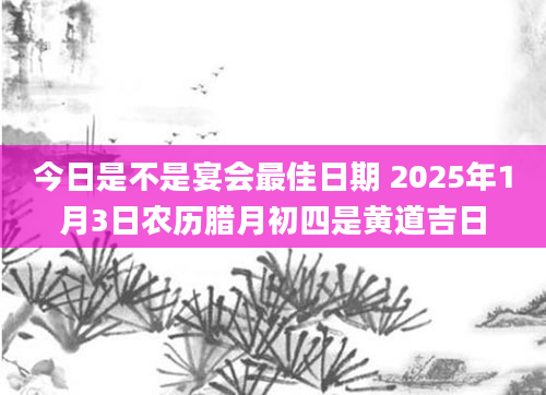 今日是不是宴会最佳日期 2025年1月3日农历腊月初四是黄道吉日当日适合宴会根据该日的黄历信息分析可得,2025年1月3日为黄道日,黄道日即是民间的黄道吉日,吉日办事可一顺百顺,对事情有着正向积极的促进作用,因此2025年1...2024-11-30