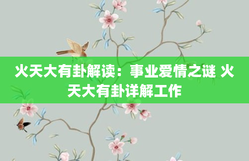 火天大有卦解读:事业爱情之谜 火天大有卦详解工作火天大有卦,上卦是离,离为火,下卦是乾,乾为天,是乾宫第八卦,也称归魂卦。火天大有卦寓意收获很大,收益较多。看一看火天大有卦,如何揭秘你的财富、事业、爱情之谜?...2025-05-19